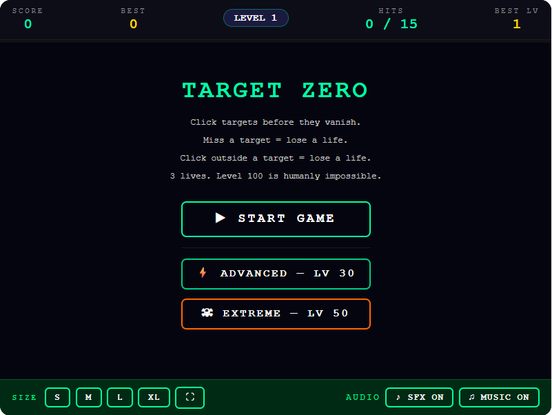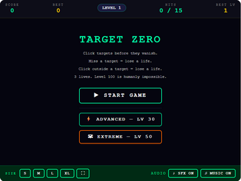Target Zero is a fast-paced click precision game where your reflexes are everything. Targets appear on screen and disappear in the blink of an eye — click them before they vanish or lose a life. Miss a target, click empty space, and you're one step closer to game over. With only 3 lives standing between you and defeat, every click counts.